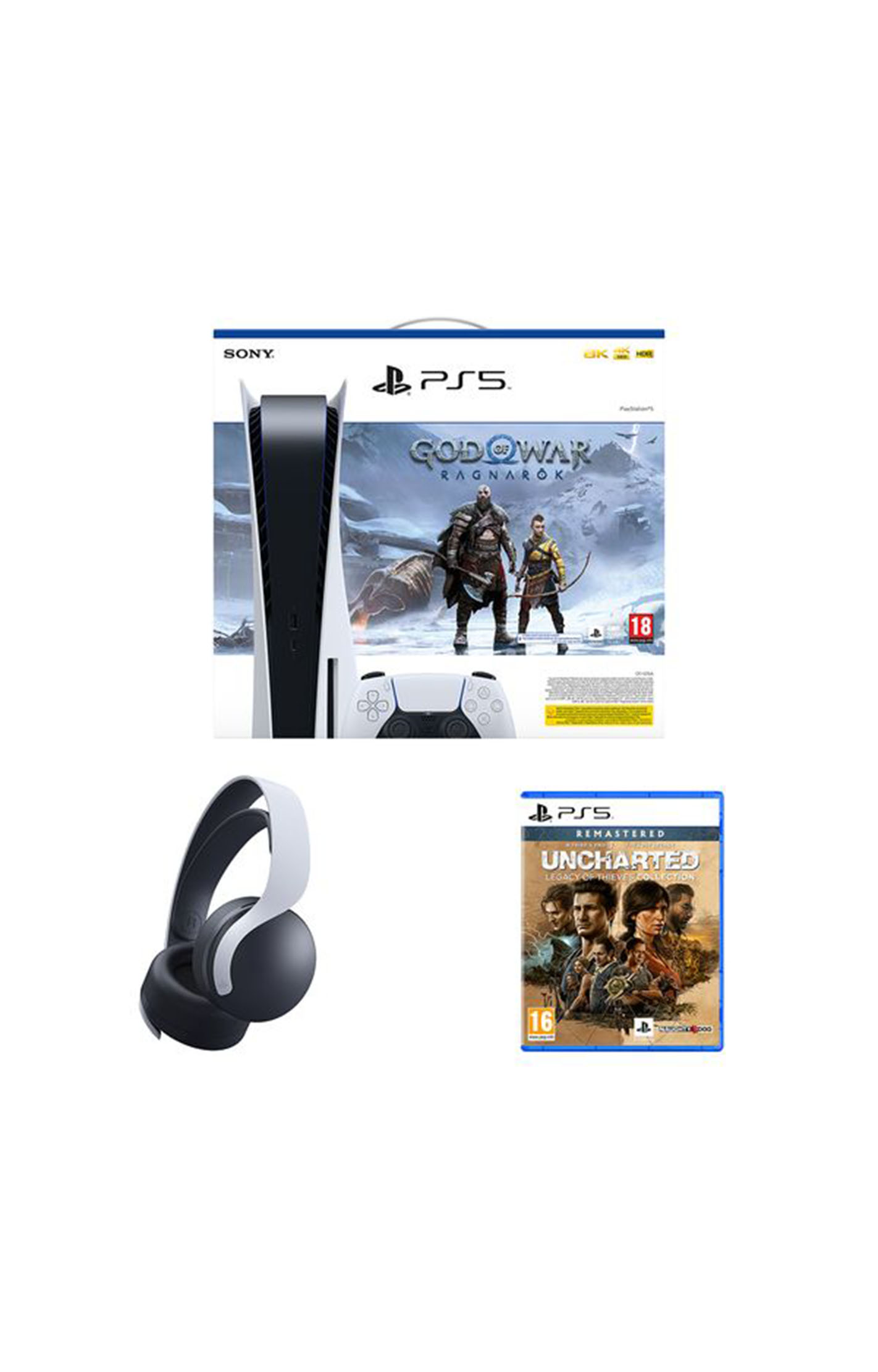 Σετ το οποίο αποτελείται την κονσόλα Playstation 5, το παιχνίδι God of War Ragnarök σε Voucher Code, το παιχνίδι Uncharted: Legacy of Thieves Collection και τα ακουστικά Sony Pulse 3D PS5 Wireless.
